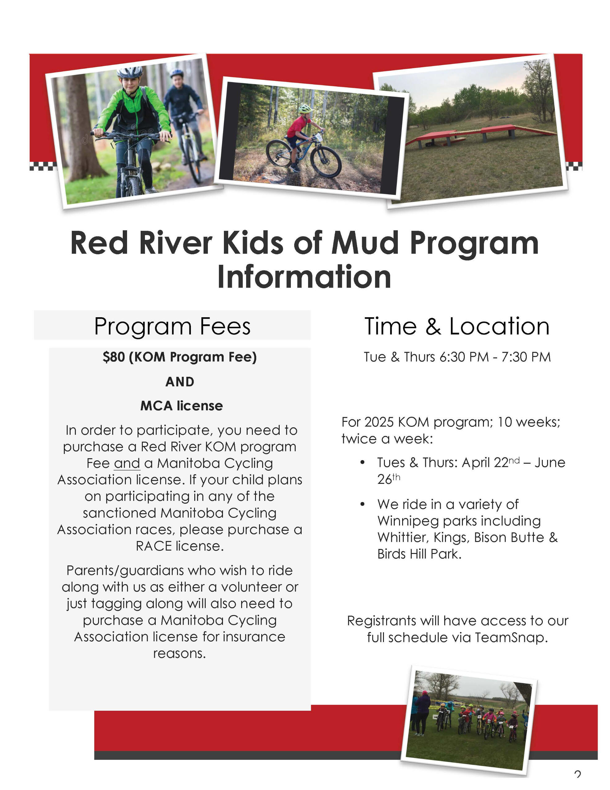 Thanks for a great 2025 season! At its 2025 AGM, the Manitoba Cycling Association reported that Red River Cycling Club is Manitoba's largest cycling club! We grew again this year, with 124 paid memberships, 61 group road rides, a successful Kids of Mud season, the Terry Fox Ride of Hope, our Ahead by a Century Ride, and a new partnership with Sookram's Brewing Co.! We look forward to riding with you in 2026! Keep on eye on this space for registration information in January 2026.