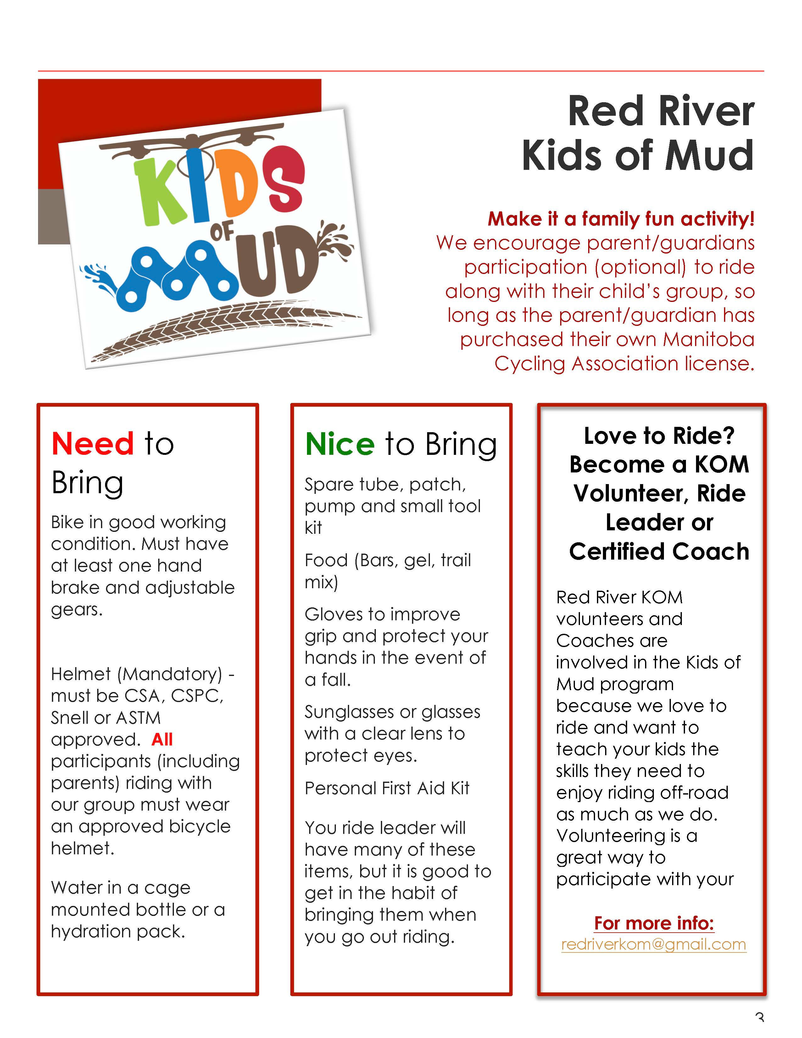 In addition to a Red River Cycling Club membership, all KOM youth participants require a current MCA membership. MCA has a Kids of Mud license, which is a general non-racing membership ($70). If your child plans on participating in any of the sanctioned MCA races, you may either purchase a Race licence at time of registration or upgrade for the cost difference before their first race ($75 up to age 8, $90 ages 9-16). All participants, including parents that are joining us as a ride-along parent (even just one time), need their own MCA license ($75) for insurance purposes; please ensure this is purchased before the start of the program in April.
